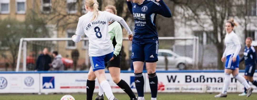 (LR) Die Fußballerinnen von Blau-Weiss Hollage haben gestern das Derby gegen die Frauen der TSG 07 Burg Gretesch mit 2:0 gewonnen. In der ersten Halbzeit waren beide Mannschaften noch ohne Torchance geblieben. Kurz nach der Halbzeit gingen die Hollagerinnen durch einen Handelfmeter in Führung. In der 63. Minute schossen sie dann ihr zweites Tor. Damit feierten die Hollagerinnen in diesem Jahr im dritten Spiel ihren dritten Sieg und bleiben auch Tabellendritte in der Frauen Oberliga Niedersachsen West. Die Osnabrückerinnen hingegen haben weiterhin vier Punkte Vorsprung auf die Abstiegsplätze.