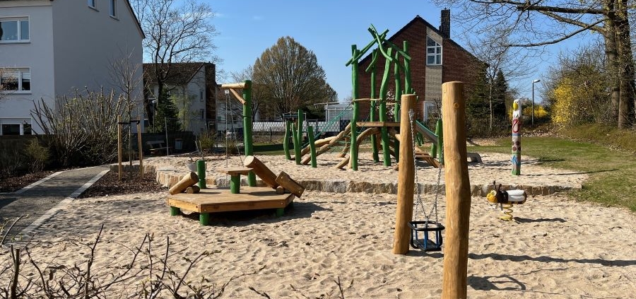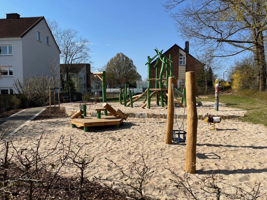 (PM) In der Nähe der Sportanlage Schinkelberg ist ein großzügiger, runderneuter Kinderspielplatz an der von-Scheffel-Straße entstanden, der ab sofort zum Spielen freigegeben ist. Die Spielbereiche sind aufgeteilt: Für die Kleinen gibt es eine Sandbaustelle mit Bagger, Federwippe sowie verschiedene Schaukeln. Die größeren Kinder zwischen sechs und 12 Jahren können sich auf dem abwechslungsreichen Kletterturm mit Rutsche erproben. Die Wiese bietet viel Platz für freies Spielen. Bei den Pflanzungen wurde auf Bienen- und Insektenfreundlichkeit geachtet. Ein Insektenhotel lädt die Kinder dazu ein, die Natur hautnah zu beobachten und zu erleben. Aber nicht nur für die Bienen gibt es was zu Naschen, auch die neugepflanzten Johannisbeersträucher sorgen für einen kleinen Vitamin C Schub und zur Stärkung zwischendurch. Mit vielseitigen Sitzmöglichkeiten wie der langen Sandsteinmauer, einer Bank-Tisch-Kombination kann der Spielplatz zum Treffpunkt für Familien der Nachbarschaft werden. Bevor der Spielplatz in Zusammenarbeit mit dem Garten- und Landschaftsbaubetrieb Steinhake umgebaut wurde, waren die Anwohnerinnen und Anwohner gefragt, ihre Wünsche und Ideen in die Planung einzubringen.