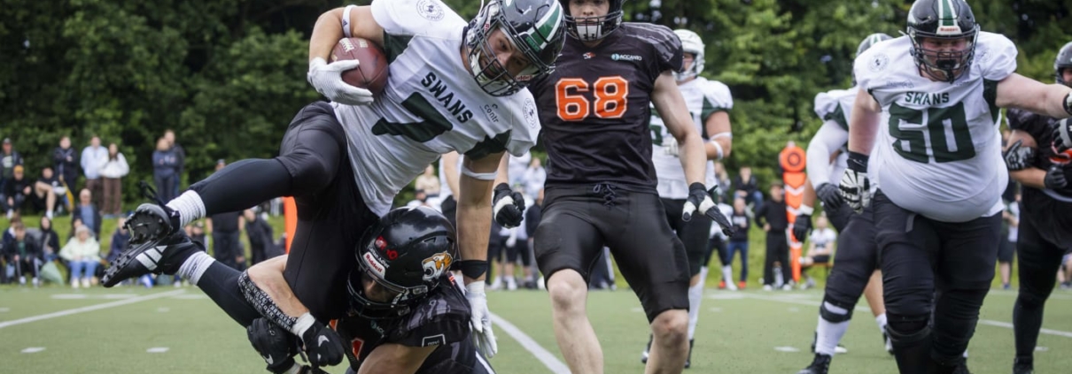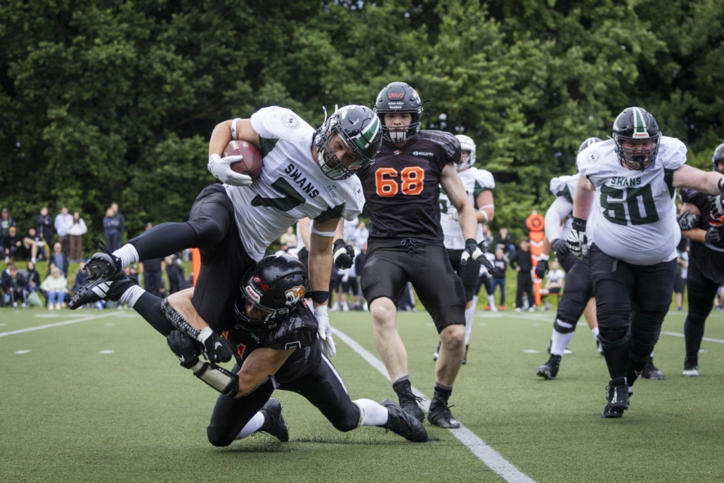 (Nat) Die Osnabrück Tigers haben am Samstag gegen die Hamburg Swans ihren 1. Saisonsieg in der 3. Football Liga gefeiert. Zur Halbzeitpause lagen sie noch mit 14:20 hinten. Die Osnabrücker drehten das Spiel aber noch durch ein starkes 4. Viertel. Am Ende entschieden sie die Partie mit 42:26 für sich. Damit feierten die Osnabrück Tigers nach ihrem Aufstieg ihren ersten Saisonsieg in der Regionalliga Nord. Als nächstes spielen die Osnabrück Tigers am Samstag gegen die Bremerhaven Seahawks.