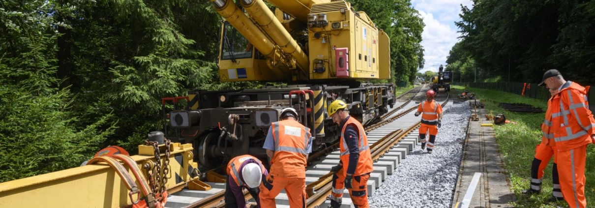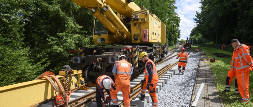 (SW) Die Verkehrsgesellschaft Landkreis Osnabrück (VLO) hat am Bahnhof Wellendorf zwei Weichen erneuert – als Teil eines Modernisierungspakets auf der Strecke Dissen–Osnabrück. Rund eine Million Euro wurden investiert, über die Hälfte davon kam vom Land Niedersachsen. Die neuen Betonschwellen ersetzen die alten Holzschwellen und versprechen mehr Stabilität und Langlebigkeit. Eingebaut wurden sie mit einem 100-Tonnen-Kran, nachdem sie per Schwertransport aus Sachsen geliefert wurden. Zusätzlich wurde das Gleisbett neu ausgerichtet, eine Schienenschmieranlage installiert und Bahnübergänge für einen künftigen Halbstundentakt vermessen – ein wichtiger Schritt für den Schienenverkehr im Osnabrücker Land.
