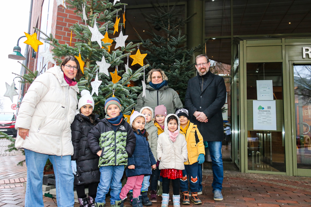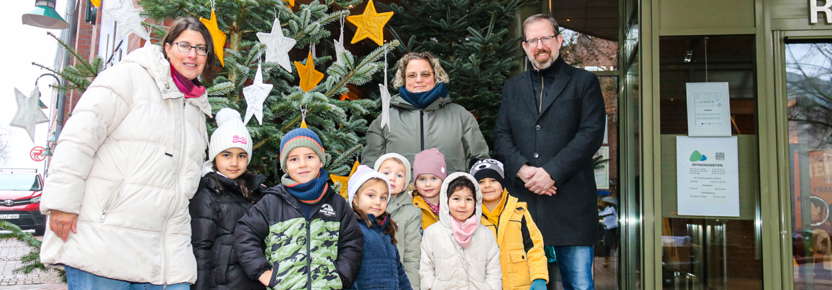 Foto: Gemeinsames Gruppenbild vor dem von den Kindern der Kita St. Marien geschmückten Weihnachtsbaum mit dem Ersten Stadtrat Alexander Herzberg. © Stadt Georgsmarienhütte