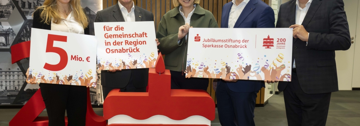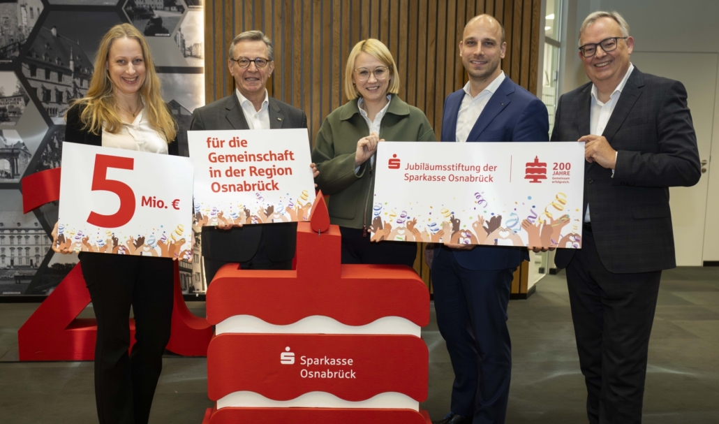(SW) Die Sparkasse Osnabrück hat anlässlich ihres 200-jährigen Jubiläums die „Jubiläumsstiftung der Sparkasse Osnabrück“ gegründet. Die Verbrauchsstiftung ist auf 200 Monate angelegt und verfügt über ein Zielvolumen von fünf Millionen Euro, um Projekte in der Region zu fördern, die der Gemeinschaft und Integration dienen. Die Stiftung unterstützt Vereine unter anderem über die Spendenplattform WirWunder und plant außerdem Leuchtturm-Projekte von besonderer Bedeutung. Ein neu gegründetes sechsköpfiges Kuratorium entscheidet über die Förderanträge.