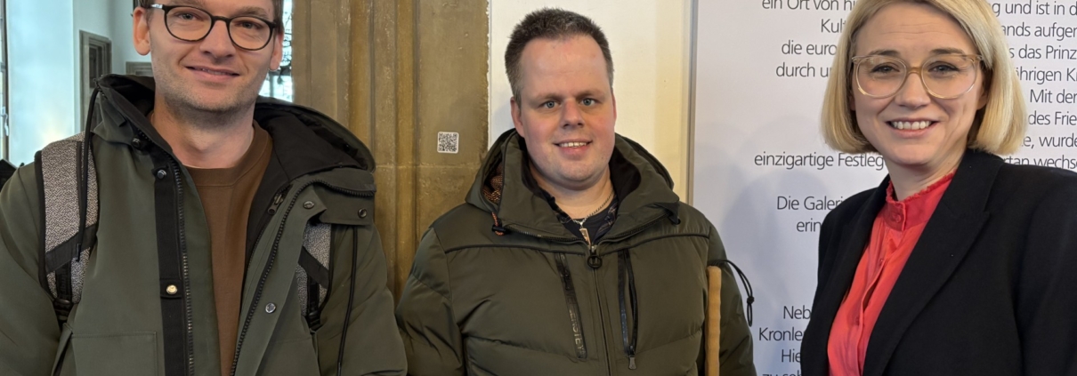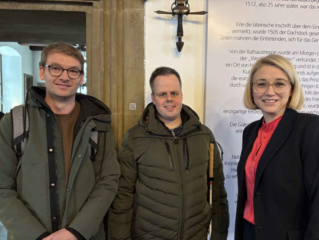 Bildunterschrift: Manuel Sprenger von der Firma Mindtags, Steven Brentrop von der städtischen Fachstelle Inklusion und Oberbürgermeisterin Katharina Pötter