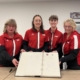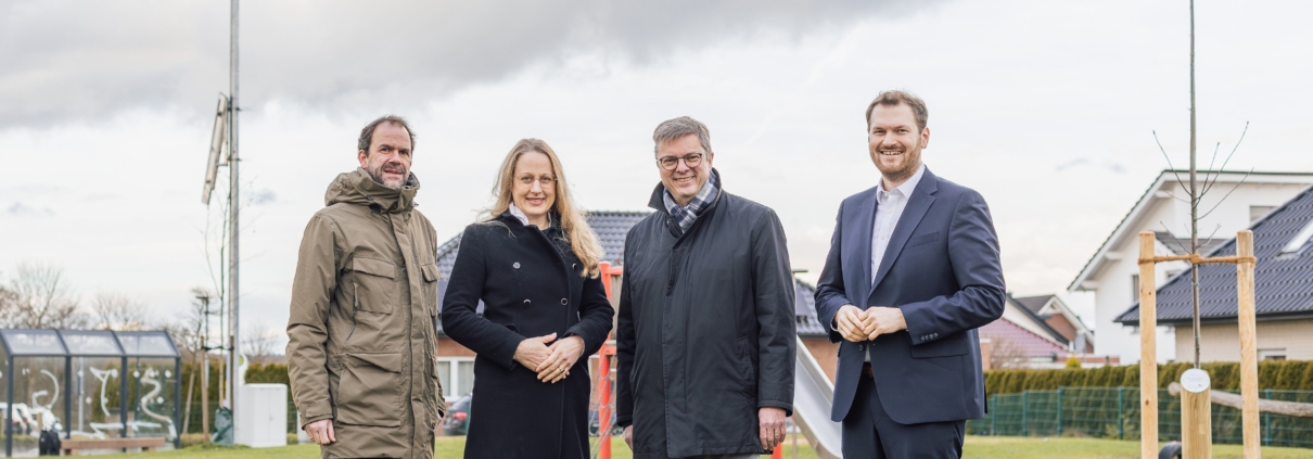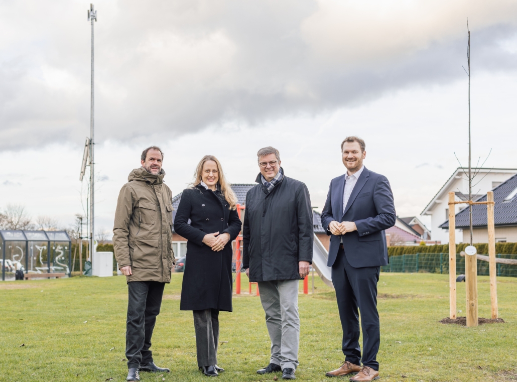Foto: Landkreis Osnabrück:Die Sirene in Ankum ist montiert. Landrätin Anna Kebschull nutzte die Gelegenheit, um die Lautsprecheranlage zu testen. An dem Termin nahmen auch Kreisrat Malte Stakowski (links) und Edgard Aschenberger (Fachdienst Ordnung – Katastrophenschutz und Rettungsdienst) teil.