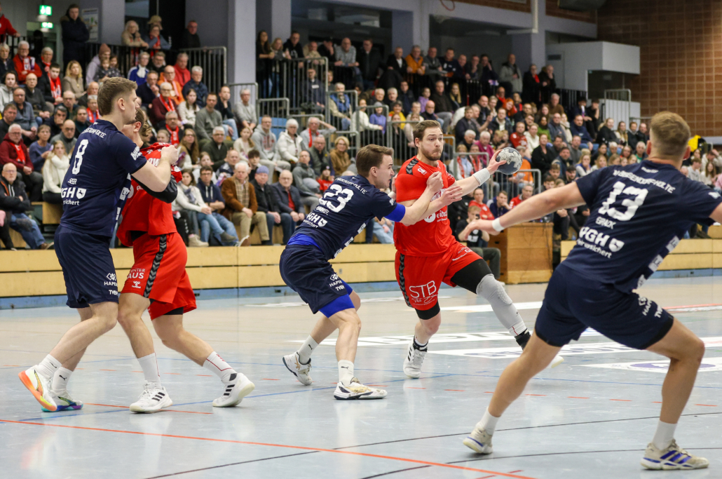 Die Partie begann mit viel Tempo auf beiden Seiten. Zwar konnte die TSG den ersten Treffer erzielen, doch auch der TVB-H ließ sich nicht lange bitten und traf durch Dennis Bormann zum 1:1. Bis zum 4:4 durch Lukas Tamms in der achten Minute gelang es keiner Mannschaft sich abzusetzen. In der Folge drückte dann vor allem Manuel Hörr dem Spiel zunächst seinen Stempel auf und brachte die Hausherren mit 7:4 in Führung. Nach dem 8:5 für die Bielefelder und einer Auszeit der Bissendorfer, begann die Aufholjagd. Angetrieben von einer starken Abwehrarbeit und guten Torhüterleistung konnte der Rückstand verkürzt werden. Durch drei Tore in Folge von Julian Jenner, Robin Schaffert und Fabian Rußwinkel glichen die Männer von der Werscher Straße wieder aus. In den letzten Minuten bis zur Halbzeitpause blieb es ein Kopf-an-Kopf-Rennen, bei dem sich keine Mannschaft absetzen konnte, sodass mit 14:13 aus Sicht der Gastgeber die Seiten gewechselt wurden.
