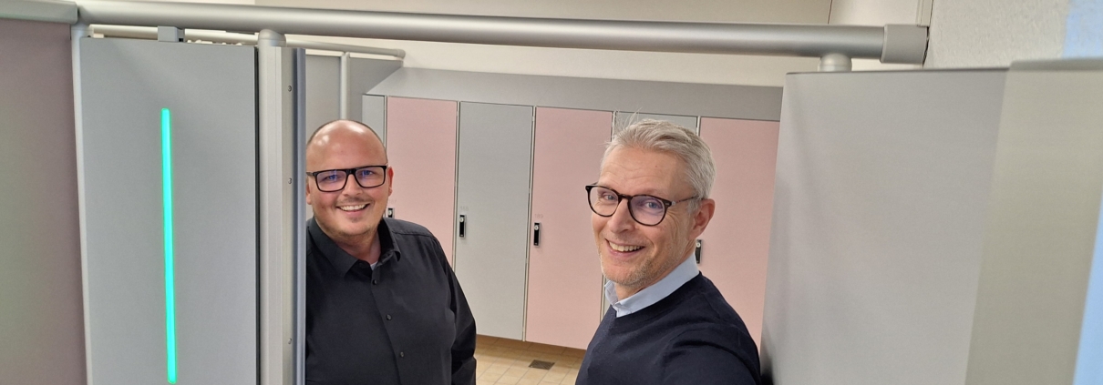 BU: Schinkelbadleiter Jens Eick (links) und Bäderchef Torsten Krier in der neuen barrierefreien Umkleide im Schinkelbad. Foto: SWO/Philipp