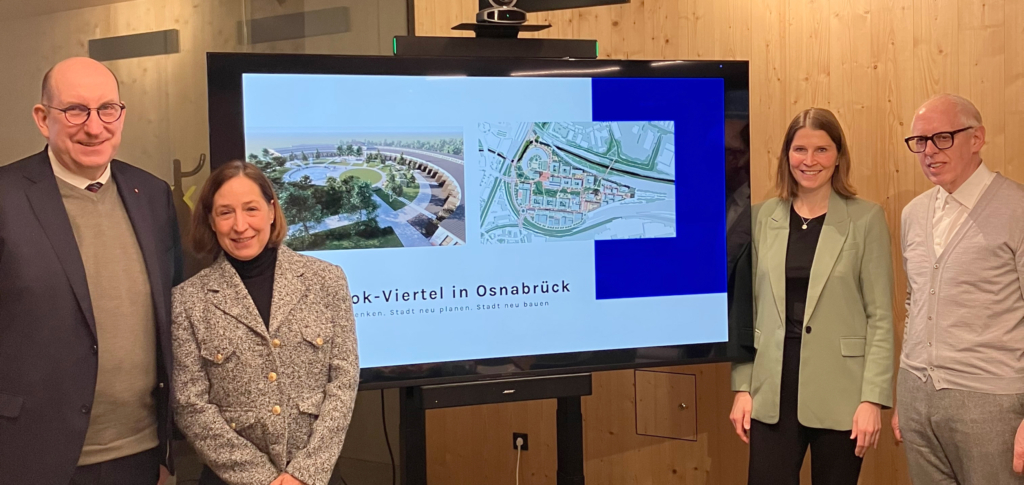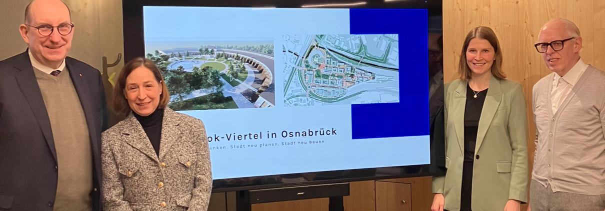 Bildunterschrift: Staatssekretär Matthias Wunderling-Weilbier und Claudia Simon, Abteilungsleiterin Städtebau und Wohnen, diskutieren mit Geschäftsführerin Sarah Wöstmann und dem Projektbeauftragten Bernhard Buderath (beide Lok-Viertel OS GmbH) den Sachstand des Modellprojektes. © Coppenrath Innovation Centre