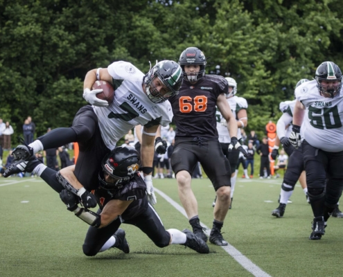 (Nat) Die Osnabrück Tigers haben am Samstag gegen die Hamburg Swans ihren 1. Saisonsieg in der 3. Football Liga gefeiert. Zur Halbzeitpause lagen sie noch mit 14:20 hinten. Die Osnabrücker drehten das Spiel aber noch durch ein starkes 4. Viertel. Am Ende entschieden sie die Partie mit 42:26 für sich...