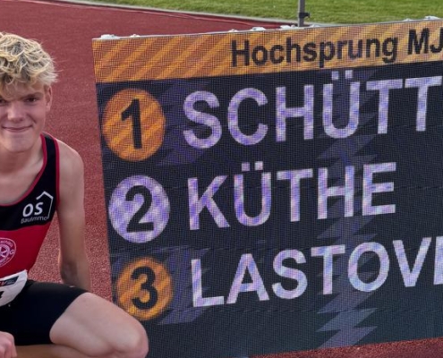 (Nat) Acht Osnabrücker Sportlerinnen und Sportler fahren dieses Wochenende zur Deutschen U16 und U20 Leichtathletik-Meisterschaft nach Koblenz. Mika Pikutzki tritt im 800 m Lauf an, Bela Kluhs im 400 m Hürdenlauf und Nevio Völkel im Hochsprung. Die drei sind außerdem mit Frederik Bätzel, Niclas Brinkmann und Matthias Apel beim Staffellauf dabei...