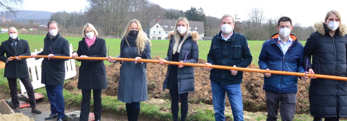 Bild: Die Technik präsentieren (von links): Christoph Hüls (Vorstandsvorsitzender Stadtwerke Osnabrück), Erster Stadtrat Alexander Herzberg (Stadt Georgsmarienhütte), Oberbürgermeisterin Katharina Pötter, Landrätin Anna Kebschull, Larissa Leer (Stabstelle Breitband Landkreis Osnabrück), Jörg Baumann (Tiefbauabteilung Stadt Georgsmarienhütte) sowie Tobias und Eva-Maria Schäfer (Inhaber Hotel Waldesruh).