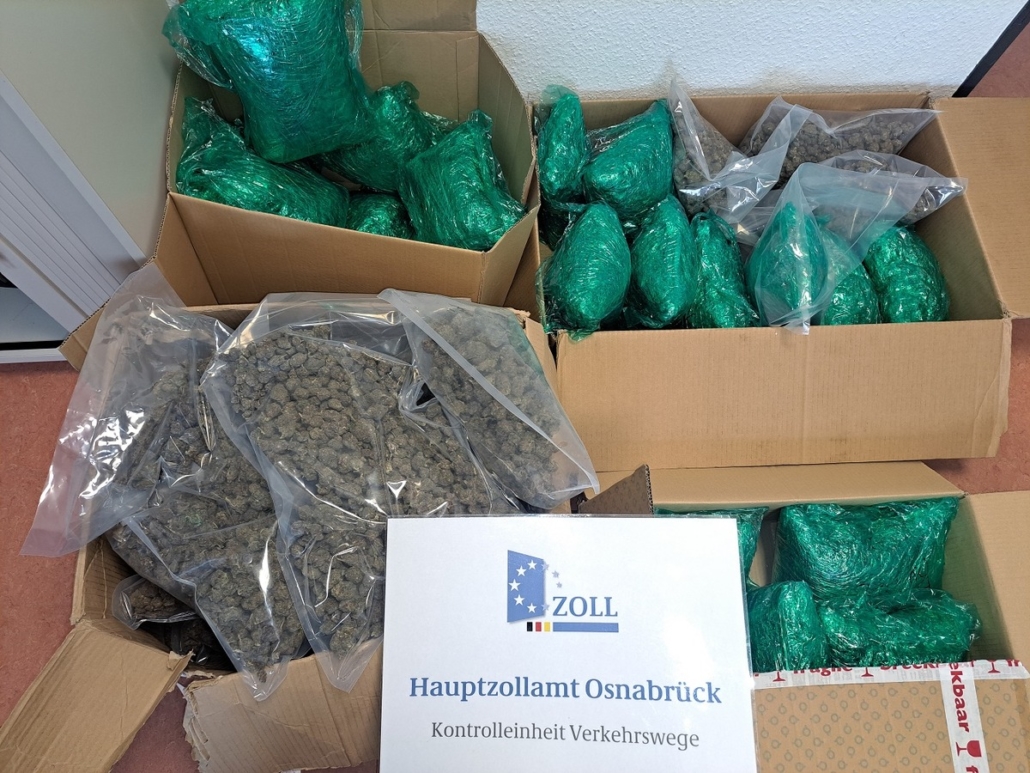 (SW) Dem Osnabrücker Zoll ist am Dienstag ein Drogenschmuggler ins Netz gegangen. Zöllner entdeckten bei einer Fahrzeugkontrolle auf dem Rastplatz Waldseite-Süd an der A 30 in einem Wagen 34 Kilogramm Marihuana im Wert von rund 335.000 Euro. Das Rauschgift war in Umzugskartons versteckt. Der Reisende gab an, mit einem Freund einen Umzug nach Amsterdam gemacht zu haben und nun auf dem Rückweg nach Bremen zu sein. Der 31-Jährige wurde daraufhin vorläufig festgenommen und dem Haftrichter beim Amtsgericht Nordhorn vorgeführt. Auf Antrag der Staatsanwaltschaft Osnabrück erging Haftbefehl. Der Beschuldigte wurde in die Justizvollzugsanstalt überführt.