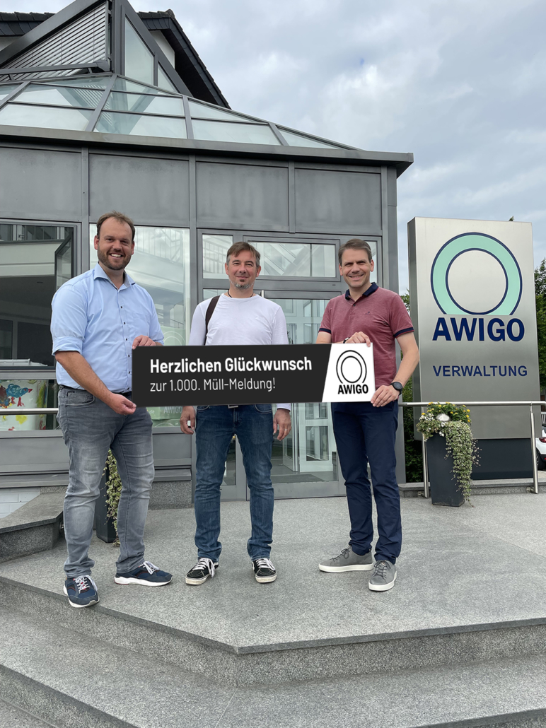 Bastian Spreckelmeyer (links) und Jens Sommerau (rechts) gratulierten Stephan Löhle (Mitte) zur 1.000. Müll-Meldung. Foto ©T. Krieger/AWIGO.