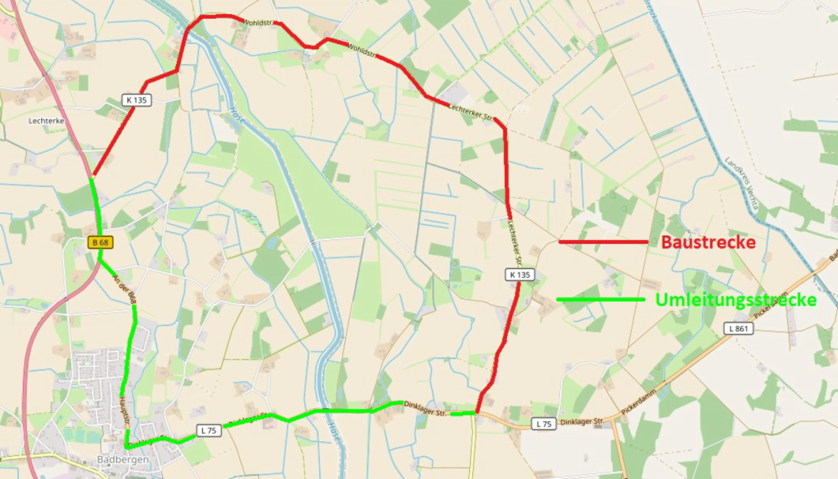 (PM) Voraussichtlich ab dem 22. August finden auf der Kreisstraße 135 (Wohldstraße, Lechterker Straße) im Bereich Badbergen (Landkreis Osnabrück) Straßenbauarbeiten statt. Auf einer Länge von rund 6,5 Kilometern wird die Fahrbahn in ganzer Breite erneuert. Wegen des aktuell schlechten Fahrbahnzustandes ist in Teilbereichen die zulässige Höchstgeschwindigkeit bereits reduziert worden. Zusätzlich werden im Fahrbahnverlauf Arbeiten an Entwässerungseinrichtungen durchgeführt. Für die Arbeiten ist je nach Witterung ein Zeitraum von rund zehn Wochen vorgesehen, also wahrscheinlich bis November. Der gesamte Bereich der K 135 wird voll gesperrt. Eine Umleitungsstrecke wird entsprechend ausgeschildert. Der Verkehr für die direkten Baustellenanlieger wird so weit wie möglich aufrechterhalten. Weitere Informationen für die direkten Anlieger erfolgen je nach Baufortschritt auch durch die ausführende Firma vor Ort. Die Arbeiten werden von der Firma Dieckmann aus Osnabrück durchgeführt. Der Landkreis bittet um Verständnis für etwaige Beeinträchtigungen.