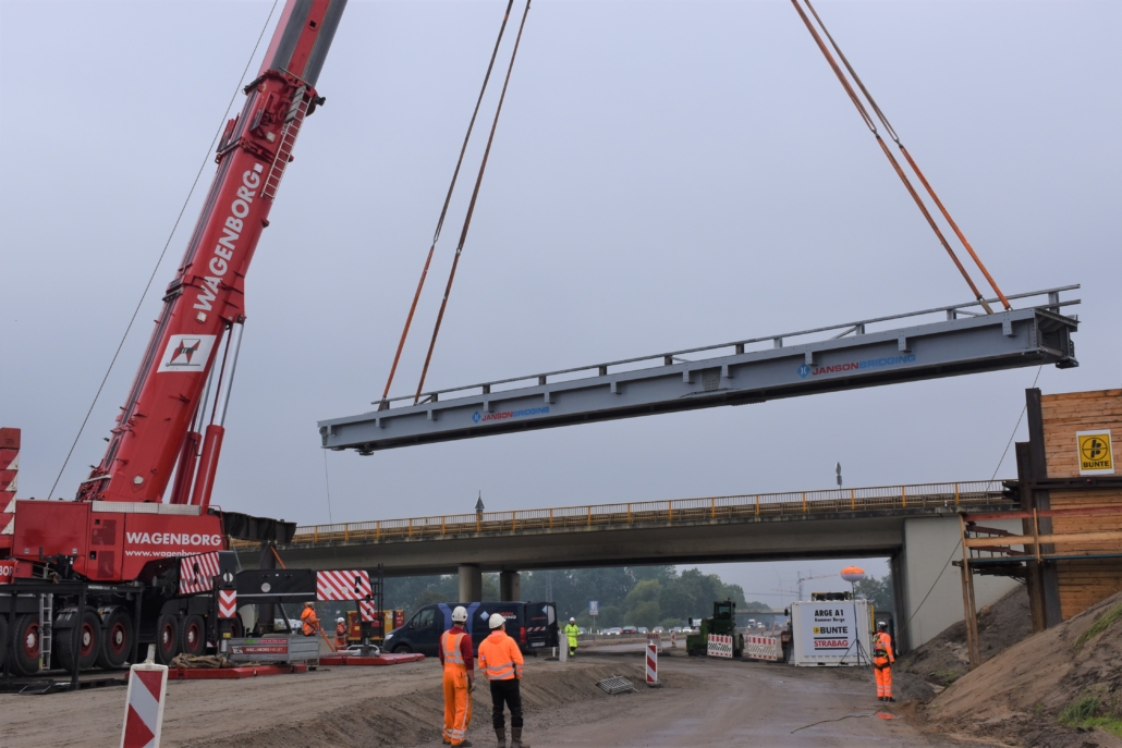 (AA)Die Autobahn Westfalen hat an diesem Wochenende eine 60 Meter lange Behelfsbrücke über die A1 bei Neuenkirchen-Vörden eingehoben. Nach abschließenden Arbeiten werden die ersten Fahrzeuge in rund vier Wochen über die Brücke fahren können, so die Autobahn Westfalen. Erst wenn die Ersatzbrücke für den Verkehr freigegeben worden ist, wird die alte Brücke abgebrochen. Der Abbruch wird voraussichtlich in vier Wochen stattfinden. Einen ähnlichen Ablauf gibt es am letzten Oktoberwochenende bei Holdorf. Eine Behelfsbrücke wird eingebaut, um die B214 an der Anschlussstelle Holdorf über die A1 zu führen.