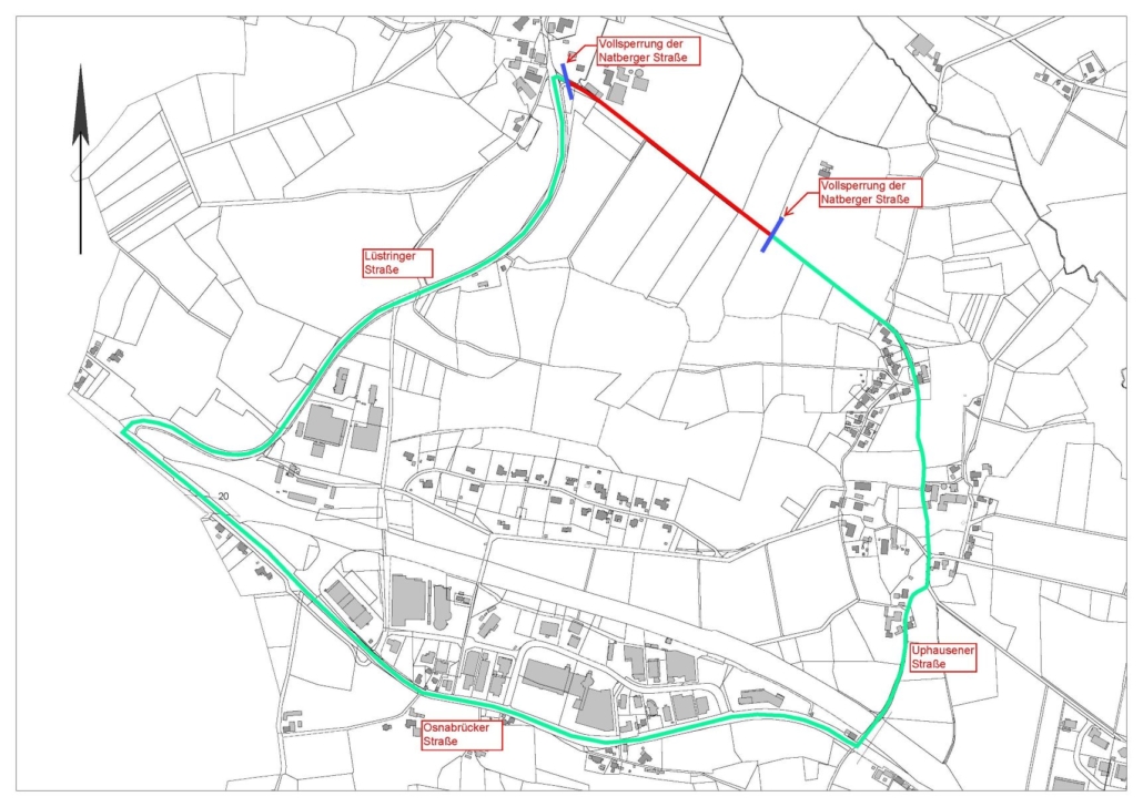 (PM) Wegen Erschließung des Gewerbegebietes „Natberger Feld“ wird ein Teilstück der Natberger Straße von der K321 (Lüstringer Straße) bis Natberger Straße, Hausnummer 3 ab Dienstag, dem 01. November 2022 gesperrt. Die Sperrung gilt voraussichtlich bis zum 30.07.2023. Eine Zufahrt zu den dahinter liegenden Bereichen der Natberger Straße und zur Uphausener Straße ist weiterhin über die Ortsteile Bissendorf und Uphausen/Eistrup möglich. Die betroffenen Anlieger werden zusätzlich gesondert von der bauausführenden Firma über die Baumaßnahmen und die damit verbundenen Verkehrsbeschränkungen informiert.