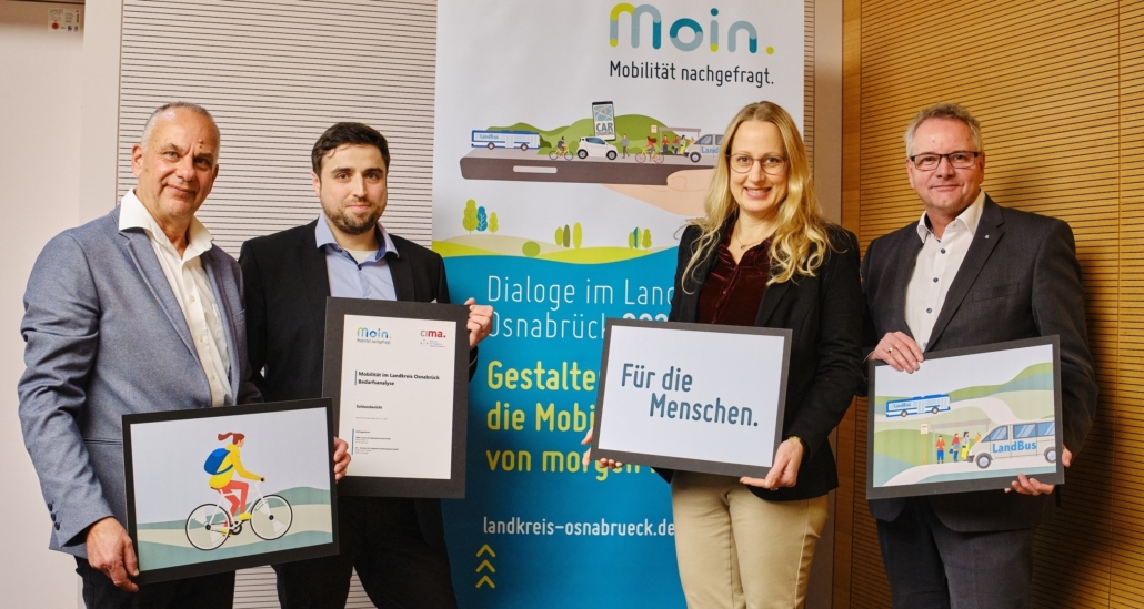 (PM)Am 12. Dezember wurden im Kreishaus die Ergebnisse der Erwartungs- und Bedarfsanalysen und der Kampagne „Moin. Mobilität nachgefragt – Dialoge im Landkreis Osnabrück 2022“ vorgestellt. Nach einer 18-monatigen Projektarbeit präsentierte die CIMA als beauftragtes Projektbüro die Erkenntnisse aus einer Datenanalyse und umfangreichen Bürger- und Expertenbefragungen. Deutlich zeigt sich: Der Landkreis Osnabrück ist aktuell eine Autofahrer-Region. Das Auto wird häufiger als Verkehrsmittel gewählt als in den umliegenden, ländlichen Kreisen. Aber: die Menschen sind bereit umzusteigen. Dafür wünschen sie sich unter anderem eine gute Infrastruktur fürs Fahrrad sowie eine bessere Verknüpfung zwischen Bahn- und Busverkehr.