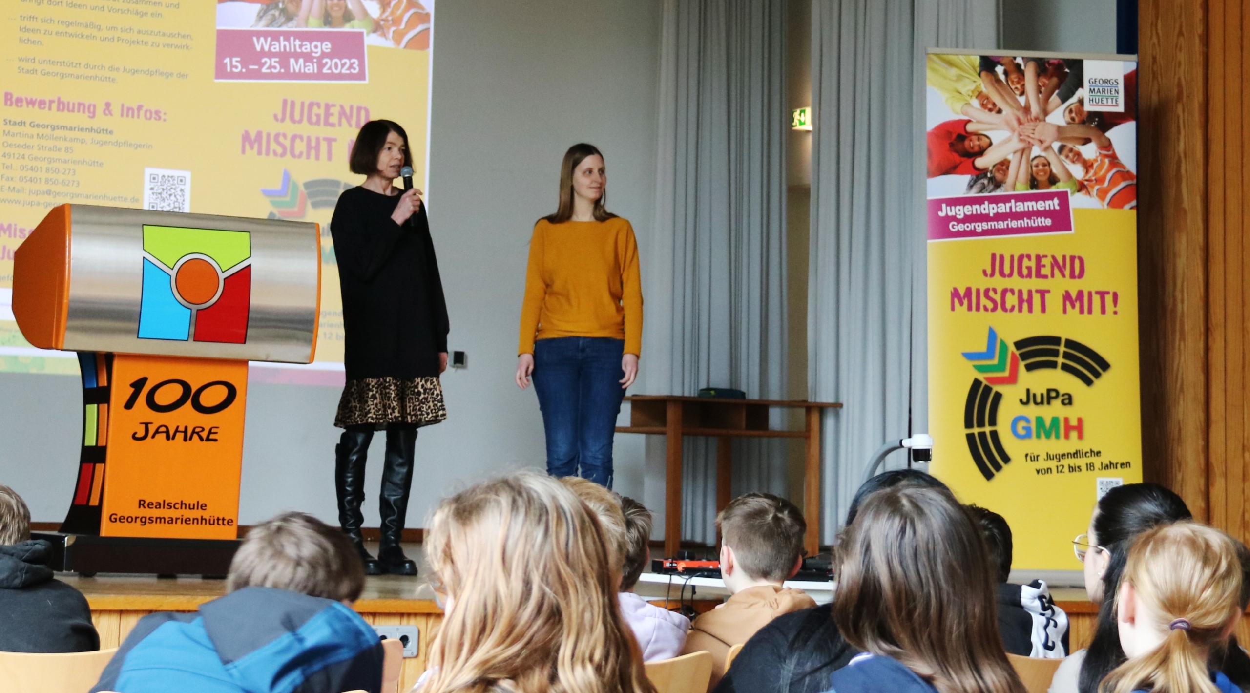 Auch die Realschule Georgsmarienhütte war Teil der Werbe-Tour für die städtische Jugendpflegerin Martina Möllenkamp (links) und Ann-Kathrin Raufhake, die dort, wie auch beim Gymnasium Oesede oder der Comeniusschule Unterstützung bei der Vorstellung des JuPa von Schülerinnen und Schülern erhielten. ©Stadt Georgsmarienhütte/Niklas Otten