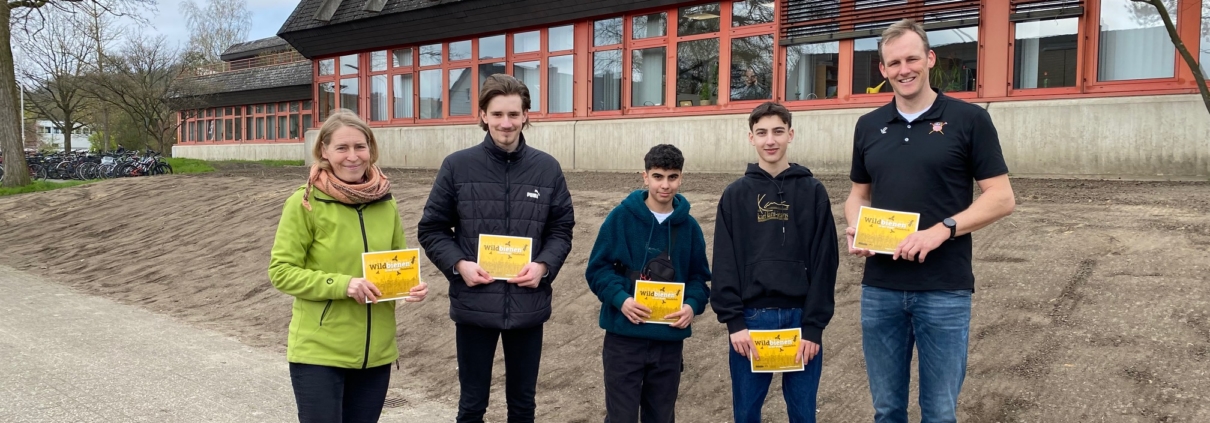 Foto: Maxi Hase (Stadt OS), die Schüler Fynn Wekenborg, Ferhat Avincsal und Keyvan Gnida sowie Christian Vennemann (projektbegleitender Lehrer an der Gesamtschule). ©Stadt Osnabrück, Lukas Grund