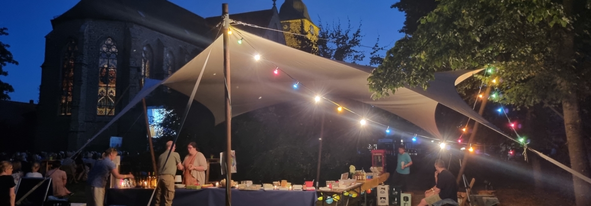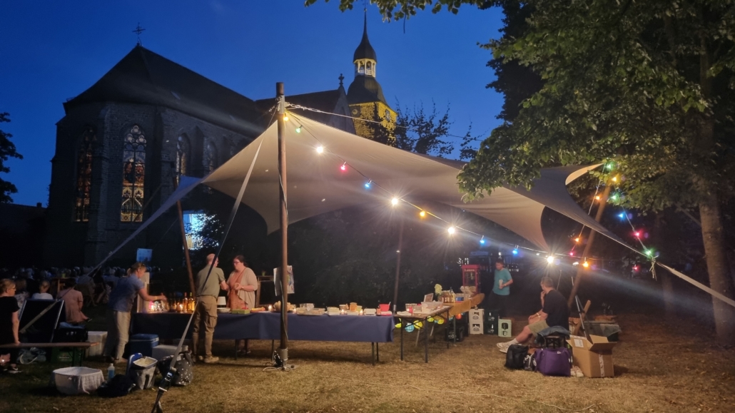 Foto: So stimmungsvoll kann Investitionsförderung sein: Der Heimatverein Alfhausen erwarb mit Unterstützung des LVO einen großen Segeltuch-Baldachin und setzte ihn u. a. beim „Sommerflimmern – Kino auf dem Lande“ ein. ©Nina Hauff/LVO