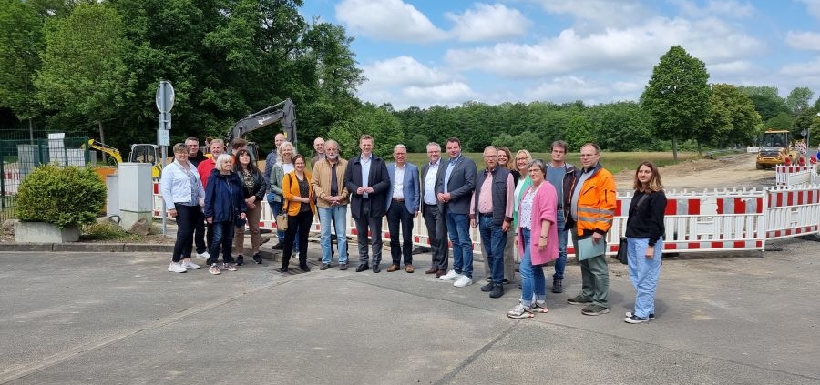 (PM/MO) Der Ausbau der Tecklenburger Straße in Hasbergen startet: Vertreter aus Kreistag, Gemeinderat sowie den Verwaltungen von Landkreis Osnabrück und der Gemeinde Hasbergen nahmen an einem Ortstermin teil. Betroffen ist der Bereich zwischen dem Naturfreibad und dem Kreisverkehrsplatz „Hüggelzwerge“. Da es sich um die Kreisstraße 305 in einer Ortsdurchfahrt handelt sind sowohl der Landkreis Osnabrück als auch die Gemeinde Hasbergen an der Umsetzung beteiligt. Der Einstieg in das Vorhaben erfolgt durch die Umgestaltung des Knotenpunktes mit der Hauptstraße (K 306) zu einem Kreisverkehrsplatz. Dies macht zeitgleich Anpassungs- und Änderungsarbeiten im unterirdischen Versorgungsnetz erforderlich. Der Anteil der Gemeinde Hasbergen an dem Vorhaben umfasst die Erneuerung der Regenwasserkanäle, der Trinkwasserleitung und der Straßenbeleuchtung. Auf den Landkreis entfällt die Erneuerung und Verbreiterung des Straßenkörpers, während die Kosten für die erneuerten Gehwege geteilt werden. Ziel ist es, sowohl für den motorisierten Verkehr als auch für Radfahrer und Fußgänger sichere Verhältnisse zu schaffen.