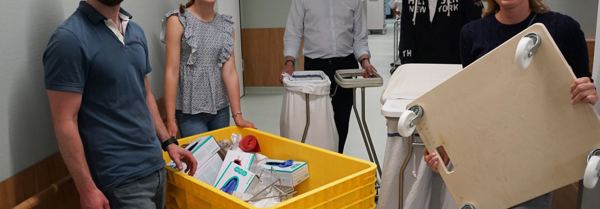 Viele Mitarbeitende der Schüchtermann-Klinik Bad Rothenfelde halfen beim Umzug auf die neuen Pflegestationen, so auch Erik Ortmann, Caroline Mönnig, Prof. Dr. Michael Böckelmann, Prof. Dr. Gerold Mönnig und Katharina Hörner (von links). Foto: Schüchtermann-Klinik