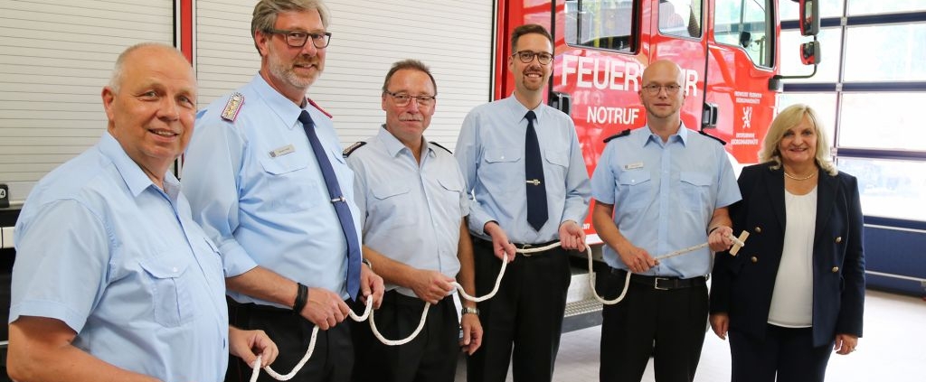 Wechsel an der „Führungsleine“ der Freiwilligen Feuerwehr Georgsmarienhütte (von links): Rainer Witt (stellv. Stadtbrandmeister), Bernard Funke (Stadtbrandmeister), Ralf Heine (noch Ortsbrandmeister bis 01.09.23), Matthias Bäumer (kommissarischer stellv. Ortsbrandmeister ab 01.09.23), Michael Steffen (Ortsbrandmeister ab 01.09.23) und Bürgermeisterin Dagmar Bahlo © Stadt Georgsmarienhütte/ Niklas Otten