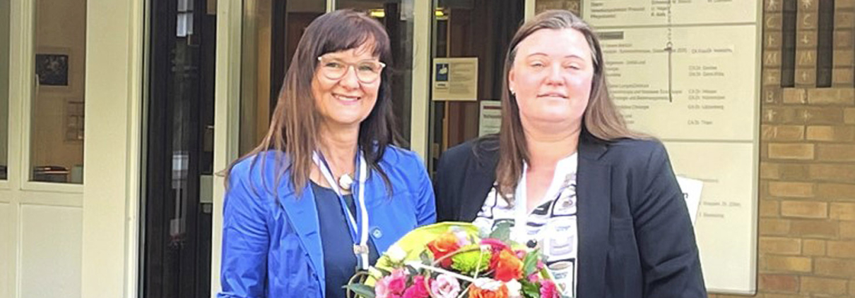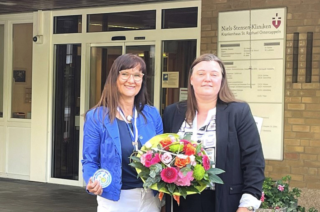 Foto: Stellvertretende Verwaltungsdirektorin Jennifer Schroth (rechts) gratuliert Regina Rommel (Stellvertretenden Pflegedirektorin Krankenhaus St. Raphael Ostercappeln) im Namen des Kollegiums zum Weltmeistertitel. ©SRO