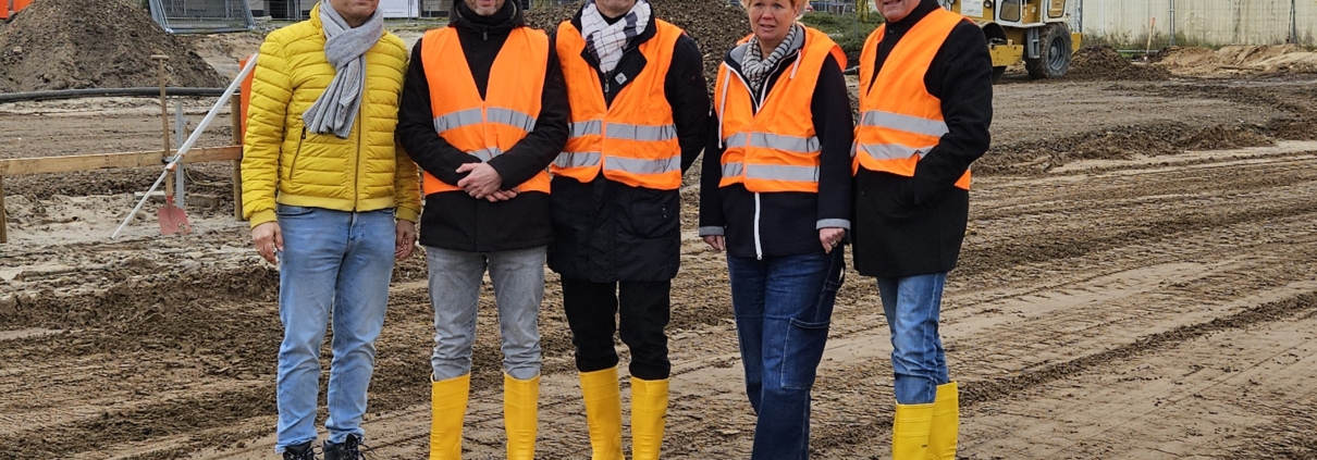 BU: Einen Überblick über den aktuellen Baufortschritt der WiO-Projekte im Landwehrviertel verschafften sich jetzt Wigand Maethner (WiO-Geschäftsführer), Marco Lange (Leiter Immobilienentwicklung SWO), Daniel Waschow (Vorstandsvorsitzender Stadtwerke Osnabrück), Susanne Hambürger dos Reis (Aufsichtsratsvorsitzende WiO) und Dr. E.h. Fritz Brickwedde (stellv. Aufsichtsratsvorsitzender WiO). ©Stadtwerke Osnabrück