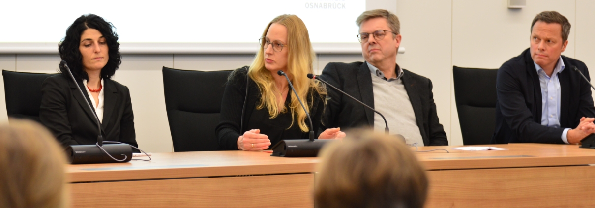 BU: Landrätin Anna Kebschull (zweite von links) nahm an der Podiumsdiskussion bei der Integrationskonferenz teil. Neben ihr sind Nino Aivazishvili-Gehne (Universität Wien), Samtgemeindebürgermeister Michael Wernke (zweiter von rechts) und Ulf Zumbrägel (Berufsschulzentrum am Westerberg Osnabrück) zu sehen. ©Landkreis Osnabrück/Henning Müller-Detert