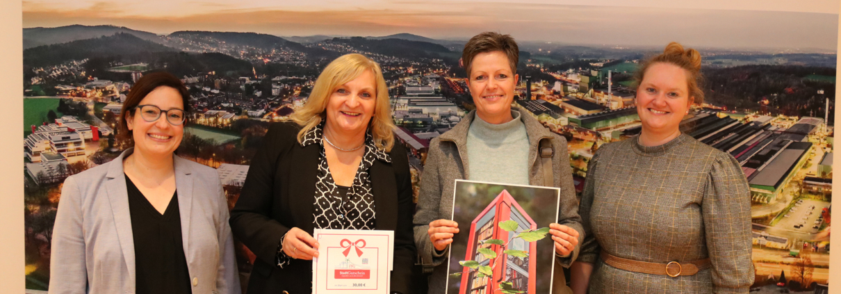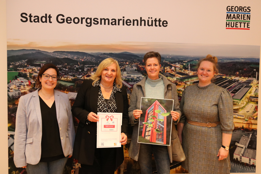 BU: Sandra Niederhuesbernd (dritte von links) konnte beim Fotowettbewerb für die neue Nachhaltigkeitsbroschüre der Stadt Georgsmarienhütte den ersten Platz belegen. Neben Bürgermeisterin Dagmar Bahlo, die den Preis im Rathaus überreichte, freuten sich über den gelungenen Beitrag auch die städtische Klimaschutzmanagerin Gesche Wiggers und Britta Wiegers (von links). ©Stadt Georgsmarienhütte