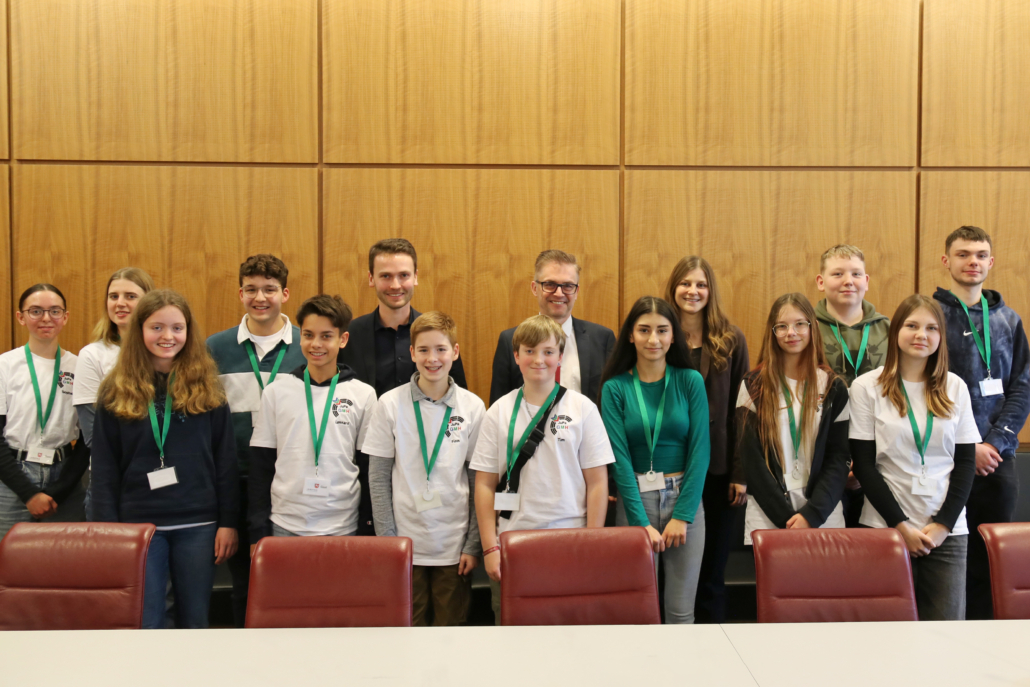 BU: Gruppenbild des Jugendparlamentes mit den Landtagsabgeordneten Jonas Pohlmann, Frank Henning und Anne Kura im Landtagsgebäude. ©Stadt Georgsmarienhütte/ Niklas Otten
