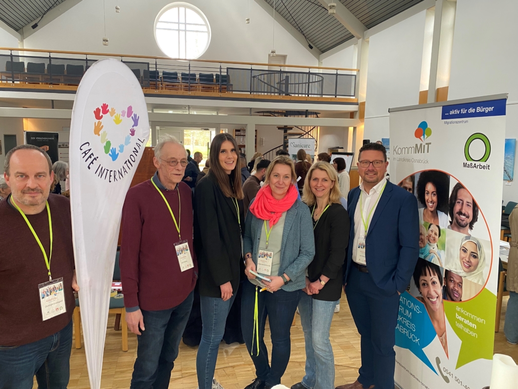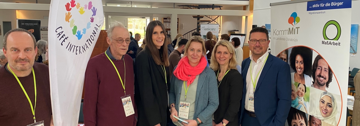 BU: Zeigten sich zufrieden mit dem Verlauf der Jobmesse (v. li.): Christoph Griefingholt, ArbeitgeberService MaßArbeit, Rolf Heitling (Café International), Johanna Kemper, Migrationszentrum MaßArbeit, Malgorzata Eichholz-Maj (Café International), Nadine Nuxoll, Bereichsleiterin Migration bei der MaßArbeit, und MaßArbeit-Vorstand Lars Hellmers. Foto: Bettina Klimek