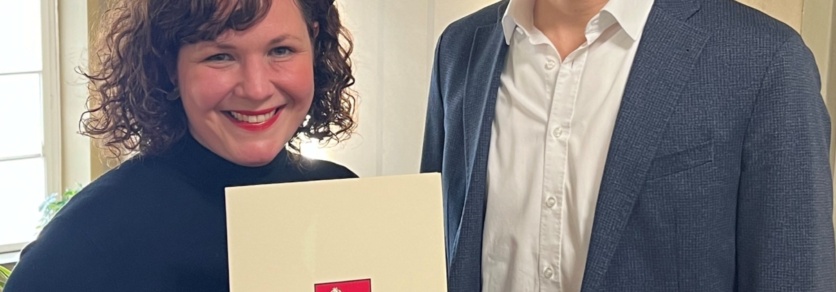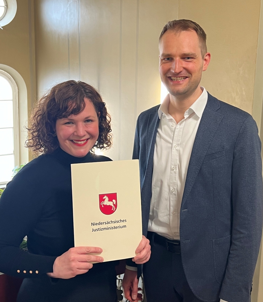(LR) Dr. Saskia Rolfes ist heute zur Richterin am Landgericht Osnabrück ernannt worden. Der Präsident des Landgerichts Dr. Thomas Veen überreichte ihr dafür eine Ernennungsurkunde. Seit 2022 ist Rolfes beim Landgericht unter anderem Mitglied des Schwurgerichts für Mordfälle an Erwachsenen. Zuvor war sie beim Amtsgericht Osnabrück tätig.