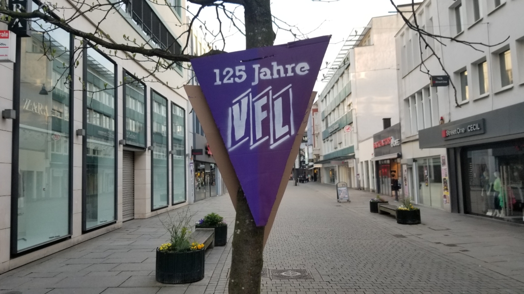 (Nat) Der VfL Osnabrück wird heute 125 Jahre alt – um dem Verein zu gratulieren, haben Fans gestern Abend und in der Nacht überall im Landkreis und in Osnabrück selbstgebastelte Wimpel aufgehängt. In Anlehnung an das Gründungsjahr des VfL 1899 haben Fans 1899 Wimpel verteilt – ziemlich sicher waren es sogar ein paar mehr, wie die NOZ schreibt. Über Monate hinweg hätten die Fans Kartons gesammelt, zurechtgeschnitten und in den Vereinsfarben besprüht mit der Aufschrift 125 Jahre VfL. Der Verein feiert sein Jubiläum heute mit einem großen Fanfest an der Bremer Brücke.