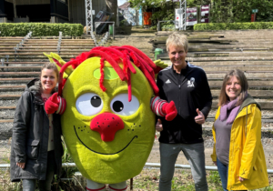 Bildunterschrift: (von links) Katharina Rokahr (Fachkoordinatorin Kultur Stadt Georgsmarienhütte), das Zappeltier und Frank Acker sowie Astrid Kämmer (städtisches Kulturbüro) freuen sich schon jetzt auf „Sommerfestival für Kids“ auf der Waldbühne am 14. Juli. / Foto: Stadt Georgsmarienhütte/ Jasmin Schulte