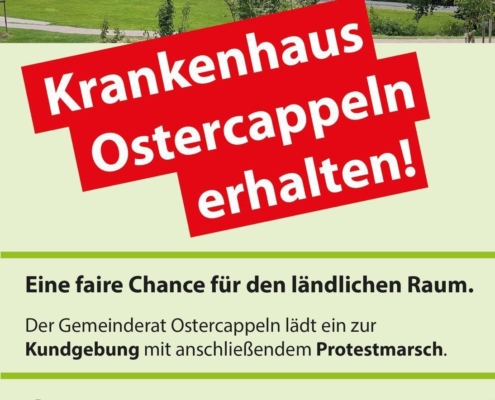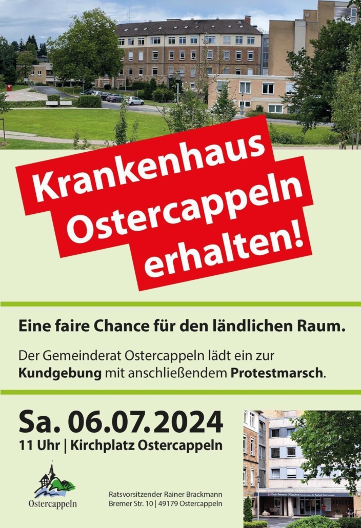 (SW) Wie die Geschäftsführung de Niels-Stensen-Kliniken vor einigen Tagen bekannt gab, soll die St. Raphael – Klinik in Ostercappeln im August des kommenden Jahres geschlossen werden. Gegen die Schließung wehren sich weiterhin viele der rund 40.000 Menschen aus dem Altkreis Wittlage. Sie fühlen sich bei einer Schließung des Krankenhauses von einer zentralen medizinischen Grund- und Regelversorgung abgeschnitten. Auch die Politik sieht das so: Der Vorsitzende des Gemeinderates in Ostercappeln, Rainer Brackmann, hat nun im Namen des gesamten Gemeinderats zu einer Kundgebung am Samstag aufgerufen. Die Kundgebung ist um 11 Uhr auf dem Kirchplatz in Ostercappeln, von dort startet der anschließende Protestmarsch.