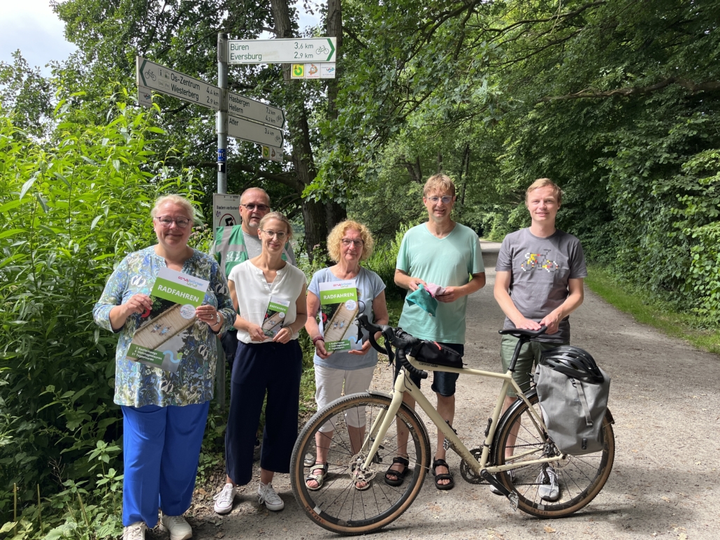 BU: Die Radroutenpaten kümmern sich ehrenamtlich gemeinsam mit der Tourismusgesellschaft Osnabrücker Land mbH um die über 50 Fahrradrouten im Osnabrücker Land. v.l.n.r.: Petra Rosenbach (TOL), Gerd Bode, Heike Albers (TOL), Elisabeth Grünbergs, Oliver Gervelmeyer, Tim Trentmann (TOL). Bild: TOL Lisa Simon