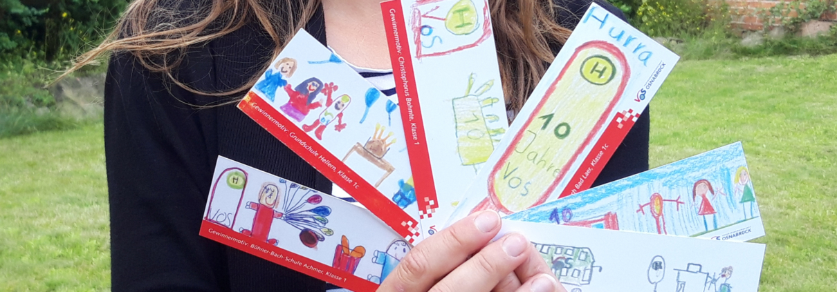 (Nat) Sieben Schulklassen aus Stadt und Landkreis Osnabrück gestalten die diesjährigen Elternfahrscheine der Osnabrücker Verkehrsgemeinschaft. Die Elternfahrscheine bekommen die Eltern der neuen Schulanfänger. Damit können sie ihre Kinder in den ersten beiden Schulwochen auf dem Schulweg kostenlos im Bus begleiten, heißt es von der VOS. Die Vorderseite der Fahrscheine schmücken sieben verschiedene selbstgemalte Bilder: Erstklässlerinnen und Erstklässler aus der Region konnten ihre Vorschläge bei einem Malwettbewerb einreichen. Die diesjährigen Gewinner kommen aus Grundschulen in Borgloh, Hagen, Neuenkirchen, Berge, Lechtingen, Ostercappeln und Osnabrück.