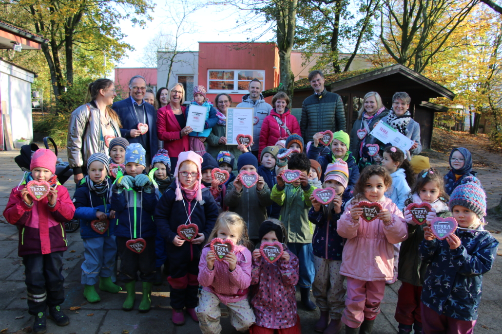 BU: Süße Überraschung: Die Kinder der evangelischen Paulus-Kindertagesstätte präsentierten die „TERRA.kita“-Herzen. Die Vertreterinnen und Vertreter der Elternschaft, der Kita, des Trägers und des Landkreises Osnabrück freuen sich über die Auszeichnung der evangelische Paulus Kindertagesstätte als Natur- und Geopark Kita. © TERRA.vita/Kerstin Matysik.