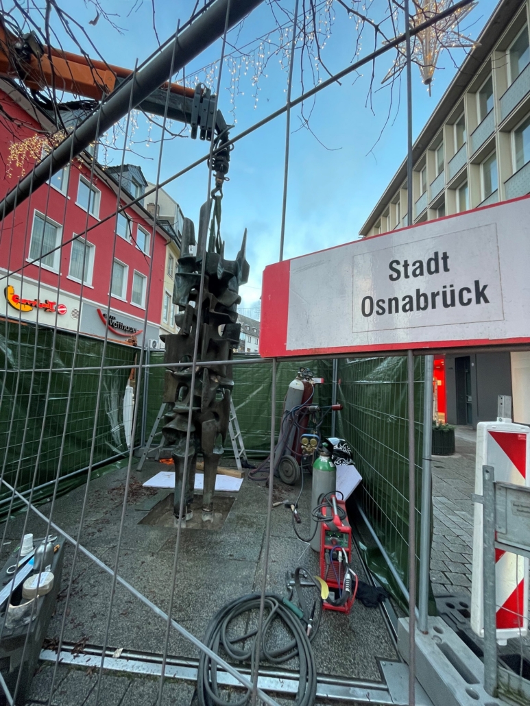 (SW) Nachdem der Tränenbrunnen heute Morgen in der Osnabrücker Fußgängerzone wieder aufgestellt werden sollte, musste bei der Prüfung des Wasserspiels festgestellt werden, dass der Brunnen leckt. Kurzerhand wurde die Bronzeplastik des Bildhauers Walter Mellmann wieder abtransportiert. Jetzt müssen die Leitungen mit aufwendiger Kameratechnik nach dem Loch abgesucht werden. In diesem Jahr wird es wohl mit der Aufstellung nichts mehr werden, vermuten die Experten, da der Weihnachtsmarkt demnächst startet und das Wetter erfahrungsgemäß auch nicht mitspielt. Ende Juli hatte ein Dienstfahrzeug der Stadt den Tränenbrunnen in der Fußgängerzone in Osnabrück versehentlich umgefahren hat. Seit dieser Zeit war der Brunnen in Reparatur.