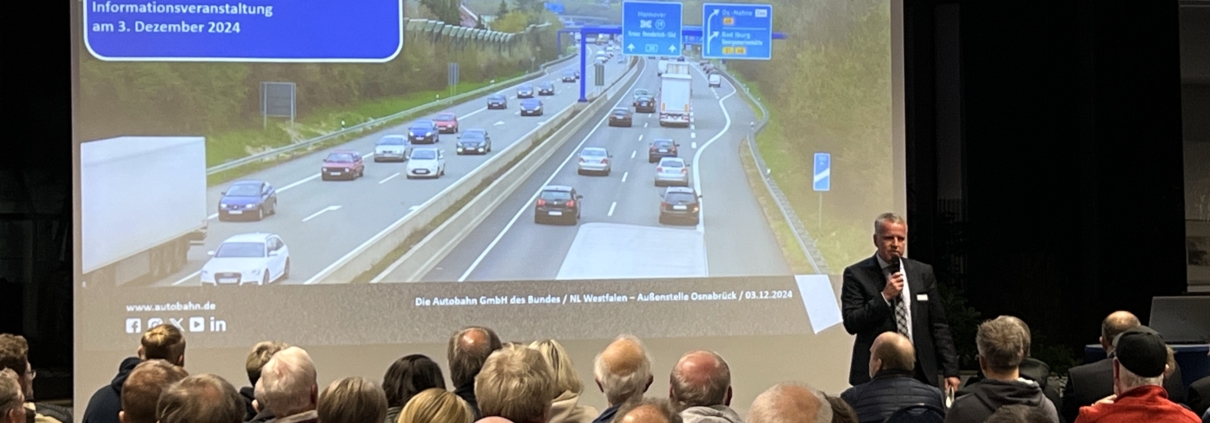 (LR) Bei der Informationsveranstaltung zum Aus- und Umbau der A30/A33 sind gestern Abend rund 160 Anlieger aus Osnabrück und der Gemeinde Hasbergen gewesen. Hierbei ging es um den sechsspurigen Ausbau der A30 zwischen Hasbergen-Gaste und dem Autobahnkreuz Osnabrück-Süd sowie dem Umbau des Autobahnkreuzes und um Anpassungen auf der A33. Die Planungen dafür seien inzwischen detailliert ausgearbeitet. In mehreren Vorträgen wurden gestern Abend unter anderem die Themen aktuelle Aktivitäten vor Ort, Straßenentwurf, Umwelt, Lärmschutz und die weiteren Planungen besprochen.