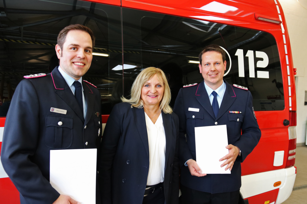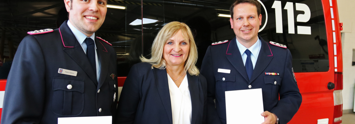 Foto: Markus Krahforst (links) als neuer Stadtbrandmeister und Philipp Stengel (rechts) als sein Stellvertreter und Bürgermeisterin Dagmar Bahlo (Mitte) © Stadt Georgsmarienhütte/Niklas Otten