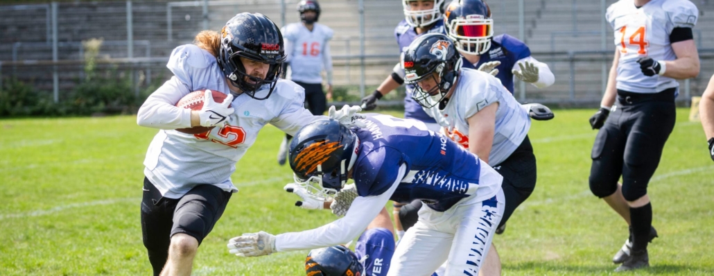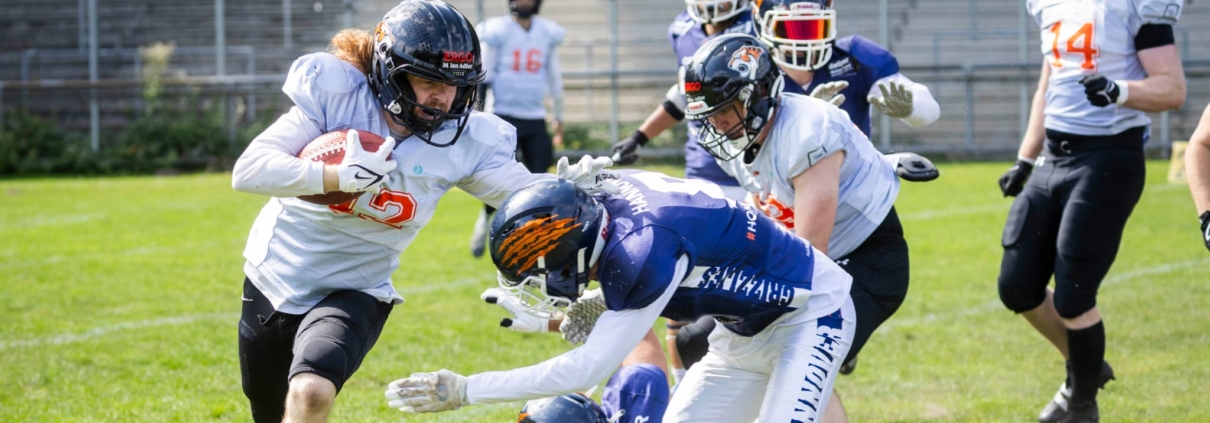 (LR) Die Osnabrück Tigers haben am Samstag gegen die Hannover Grizzlies mit 40:36 gewonnen. Zur Halbzeit lagen die Osnabrücker Footballer noch mit 13:29 zurück. Jedoch erzielten sie in der zweiten Halbzeit noch 27 Punkte und drehten somit das Spiel. Damit haben die Osnabrück Tigers bisher in der Saison ihre drei Auswärtsspiele gewonnen. Mit drei Siegen und zwei Niederlagen stehen die Tigers derzeit auf dem zweiten Platz in der 3. Football Liga Nord. Als nächstes spielen die Tigers nächste Woche Samstag zu Hause gegen Bremerhaven.