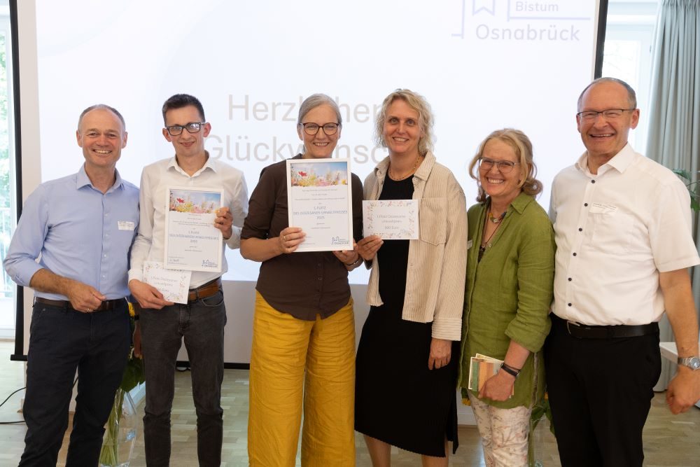 (MO) Der Umweltpreis des Bistums Osnabrück geht in diesem Jahr an zwei Hauptgewinner: den „WinterKurs 82“ der Katholischen Landvolkhochschule Oesede und eine Kindergartengruppe aus Papenburg. Die Landwirtinnen und Landwirte des Winterkurses wurden für ihr Projekt „Biodiversität für die Landwirtschaft“ ausgezeichnet, bei dem sie Biotopflächen wie Blühwiesen, Hecken und Nistbereiche für Insekten angelegt haben. Ebenfalls auf Platz eins kam das Papenburger Projekt „Kleine Klimahelden“. Dabei erleben Kinder den Klimawandel im Wald, stellen Fragen, pflanzen Bäume und dokumentieren ihre Erkenntnisse in einem Bilderbuch. Beide Gewinnergruppen erhielten je 600 Euro. Insgesamt hatten sich 25 Initiativen um den Umweltpreis beworben. Weitere Auszeichnungen gingen nach Meppen, Twist, Georgsmarienhütte, Quakenbrück und auf die Insel Norderney. Generalvikar Ulrich Beckwermert lobte bei der Preisverleihung in Oesede das große ökologische Engagement und die Kreativität aller Teilnehmenden.