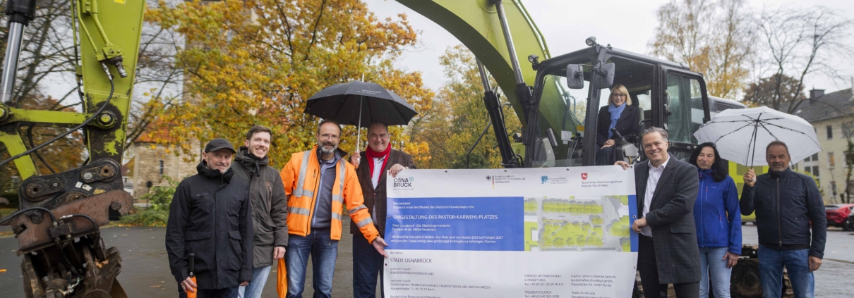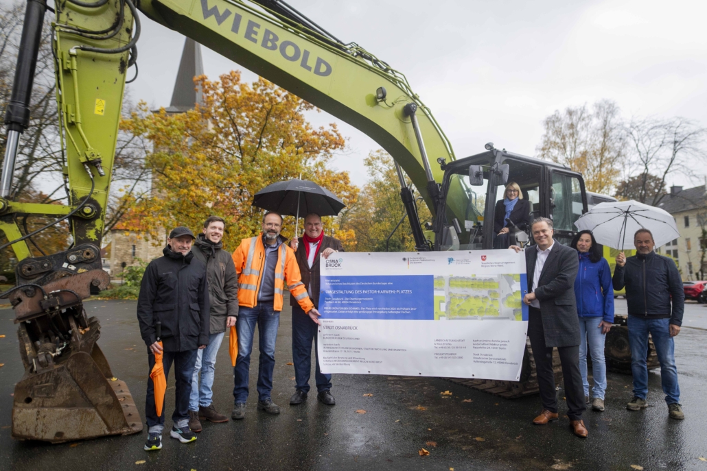 (HG) Im Osnabrücker Stadtteil Schinkel haben heute die Bauarbeiten für den neuen Pastor-Karwehl-Platz begonnen. Aus der großen Parkplatzfläche – etwa so groß wie zwei Handballfelder – soll ein grüner Treffpunkt für das Quartier entstehen. Rund die Hälfte der Fläche wird entsiegelt und in einen kleinen Park mit Sitzplätzen, Bewegungsangeboten und einem Trinkwasserbrunnen verwandelt. Mit dem neuen Platz soll ein Treffpunkt für Bürgerinnen und Bürger entstehen, der zu mehr Zusammenkommen verhelfen soll, sagt die Stadt Osnabrück. Die Kosten für den Umbau liegen bei rund 2,4 Millionen Euro, davon kommen über 1,8 Millionen vom Bund. Der neue Pastor-Karwehl-Platz soll erst im Frühjahr 2027 fertiggestellt werden.