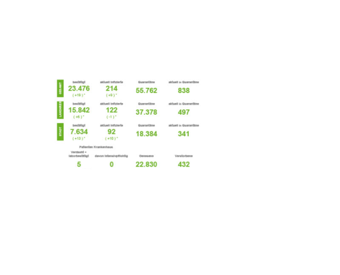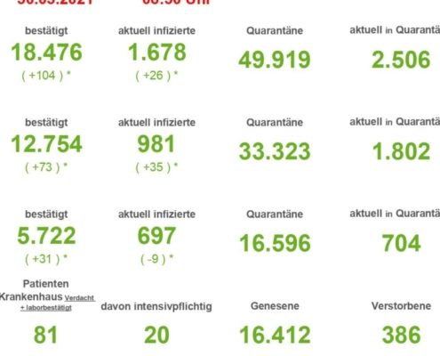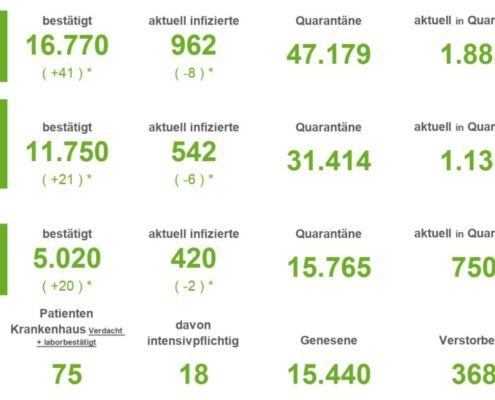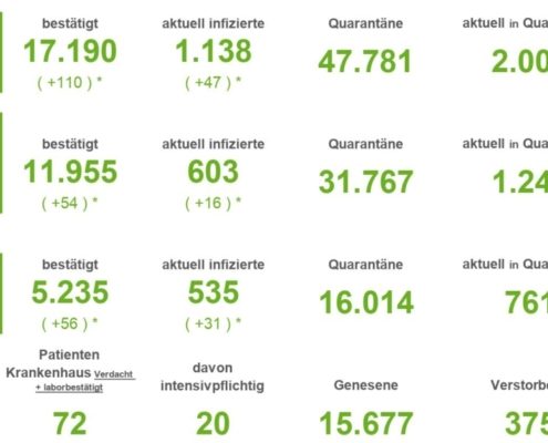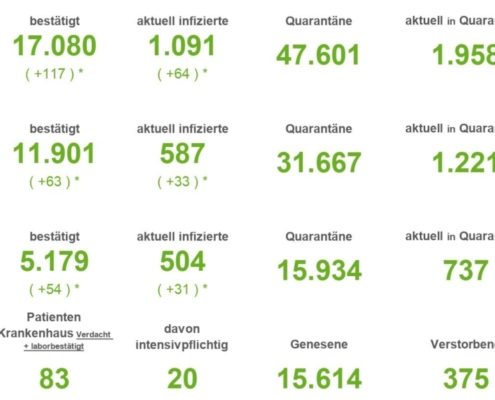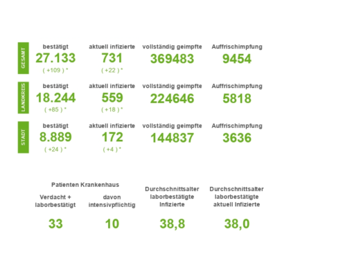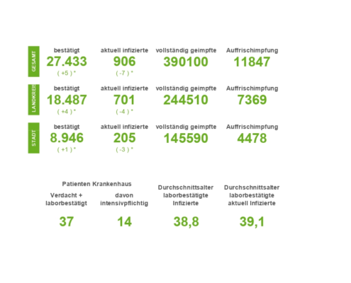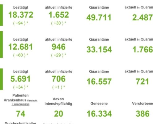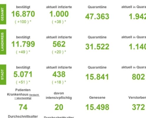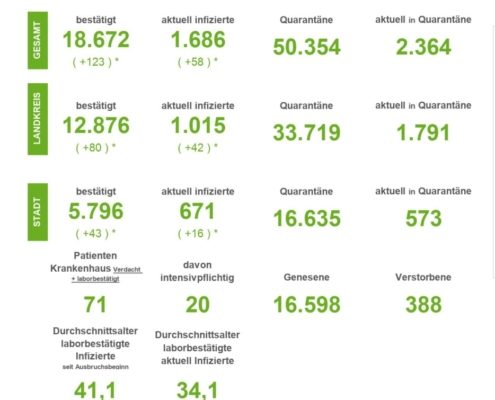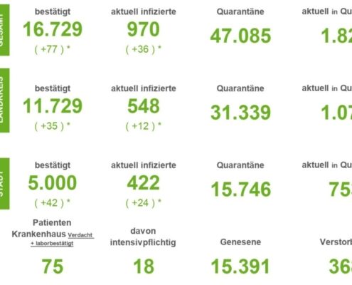 (SW) In Stadt und Landkreis gibt es innerhalb von 24 Stunden 1.235 registrierte Corona-Neuinfektionen. Nach Abzug der Menschen, die ihre Erkrankung überstanden haben, sind aktuell 7.691 Menschen Corona positiv. Drei weitere Menschen sind seit gestern in Verbindung mit Covid-19 verstorben – insgesamt sind es 548 Todesfälle in Stadt und Landkreis seit Ausbruch der Pandemie....