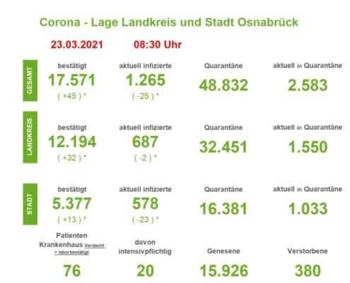 (SW) Über das Wochenende sind dem Gesundheitsdienst für Landkreis und Stadt Osnabrück 736 Corona-Neuinfektionen gemeldet worden. Nach Abzug der Genesenen sinkt die Zahl der aktuell Infizierten auf 8.656 Personen. Auch die Zahl der Menschen, die mit Corona in den Krankenhäusern liegen fällt von 133 auf 120 Personen. Davon werden 17 Menschen mit schwerem Verlauf auf...
