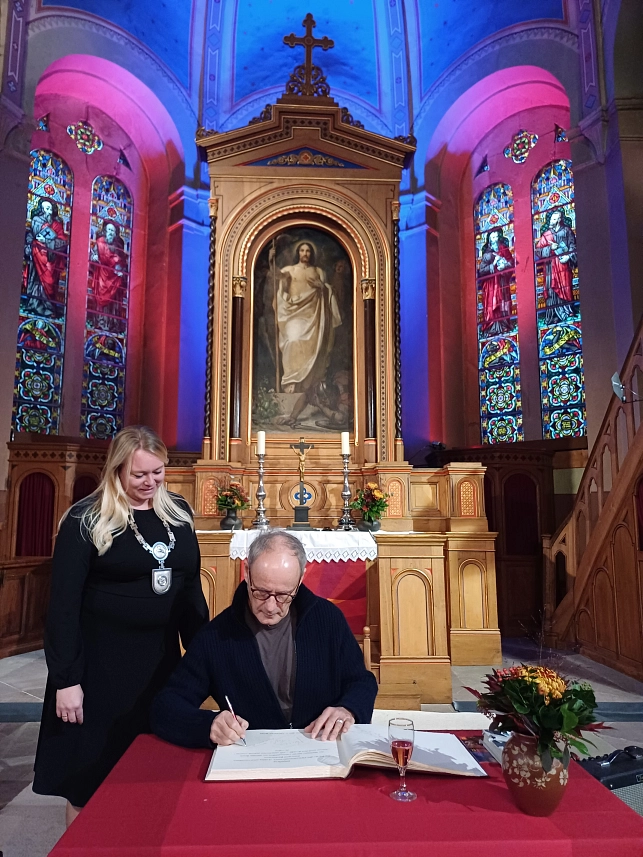 Stadt MelleModerator und Buchautor Reinhold Beckmann trägt sich ins Goldene Buch der Stadt Melle ein