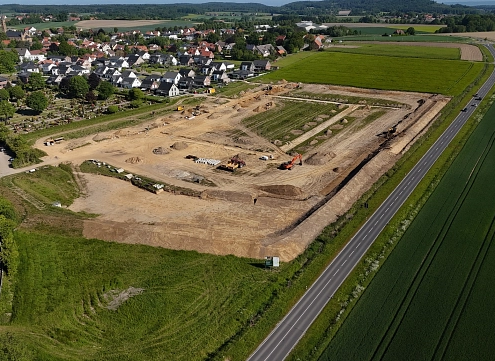 (LR) Im Meller Stadtteil Buer hat es den ersten Spatenstich im Baugebiet „An der Blanken Mühle II“ gegeben. Seit März laufen hier schon Arbeiten zur Herstellung der Kanalisation und der Baustraße. Außerdem wird die vorhandene Regenrückhaltung erweitert, ein Lärmschutzwall errichtet und Grünflächen angelegt...